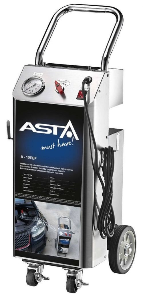 Specjalistyczne urządzenie mobilne z manometrem ze stali nierdzewnej wykorzystywane do odpowietrzania i wymiany płynów hamulcowych ze zbiornikiem o pojemności 5l oraz z przewodami i kablem przyłączeniowym do akumulatora. Umożliwia szybką i bezpieczną wymianę całego płynu układu hamulcowego za pierwszym podejściem bez ryzyka, że zabraknie płynu w pojemniku. Pompa zasilana poprzez akumulator samochodowy 12V z regulacją ciśnienia do 2.5 Bara (36psi).