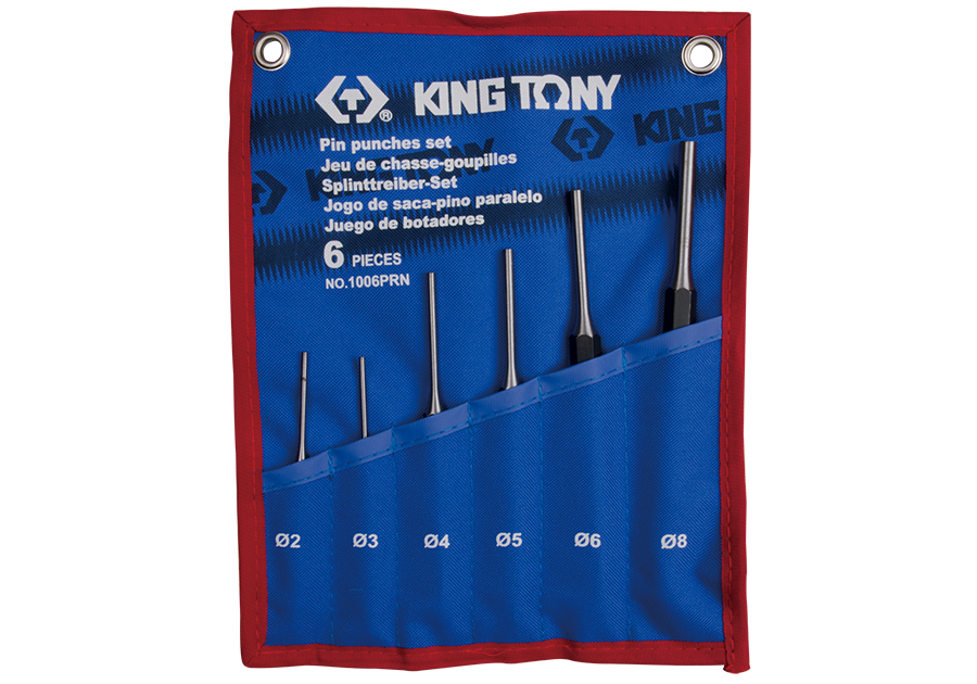 Zestaw wybijaków igłowych 6 sztuk. W skład zestawu wchodzą wybijaki o następujących rozmiarach: 2x30, 3x40, 4x50, 5x55, 6x55, 8x60. Wybijaki wykonane są z wysokiej jakości stali chromowo - wanadowej, a ich powierzchnia została poddana fosforowaniu. Cały zestaw w etui z materiału ze wzmacnianymi uchwytami do powieszenia na ścianie.