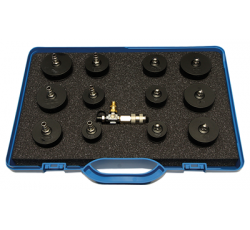 Zestaw do badania szczelności układów doładowania - TURBO. Nadaje się do wszystkich systemów ładowania ciśnienia ze łączami z kołnierzem. Stosuje się do wykrywania nieszczelności w elementach systemu turbodoładowania, takich jak turbosprężarki, węże ciśnieniowe, intercooler, etc. Diagnostyka odbywa się przy wyłączonym silniku i zabudowanych diagnozowanych komponentach. Przyrząd może warunkowo być wykorzystany do weryfi kacji zaworu EGR. Działa zasilany z układu sprężonego powietrza przy użyciu stadardowego pistoletu do pompowania opon. Masa - zawór ograniczający ciśnienie ze względu na wysokie ciśnienia testujące - urządzenie testowe z korkami o średnicach 31, 38, 46, 51, 56, 61 mm 2,50 kg - nadaje się do wielu marek samochodów np.: VW, Mercedes-Benz, Renault, Nissan, etc