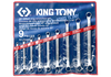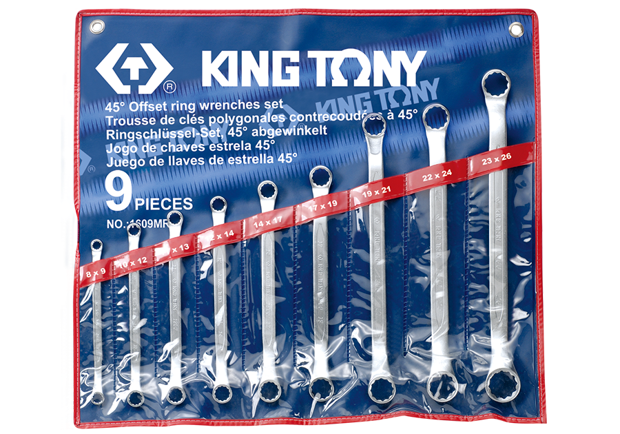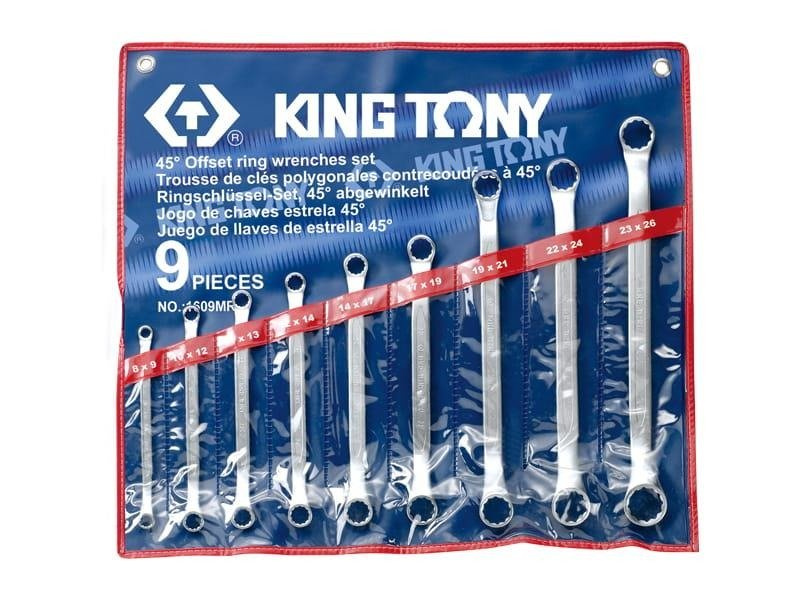 Komplet kluczy odgiętych o 45 stopni firmy King Tony. W zestawie znajduje się 9 kluczy w rozmiarach [mm]: 8x9, 10x12, 11x13, 12x14, 14x17, 17x19, 19x21, 22x24, 23x26. Zestaw w zgrabnym etui do powieszenia na ścianie.