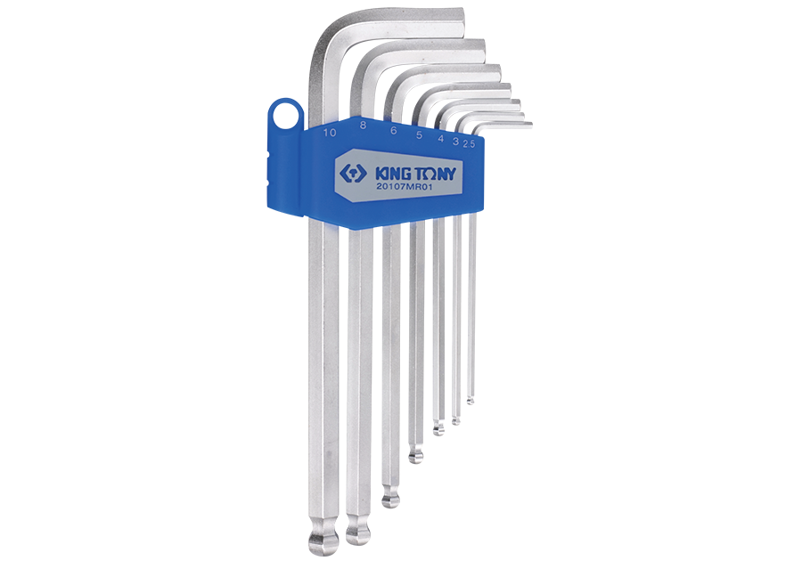 Zestaw 7 kluczy imbusowych hex z kulką profesjonalnej marki King Tony. W zestawie znajdują się długie imbusy z serii 1130xxM w rozmiarach 2.5, 3, 4, 5, 6, 8, 10 [mm]. Zestaw w plastikowym uchwycie. Kulka na końcu dłuższego ramienia klucza pomaga odkręcać śruby o utrudnionym dostępie pod kątem.