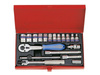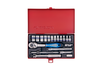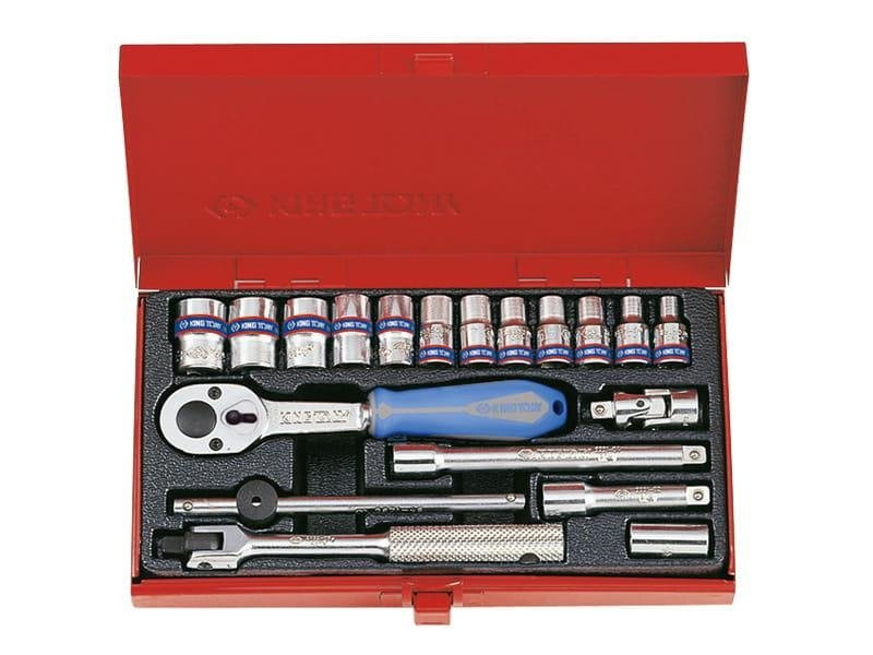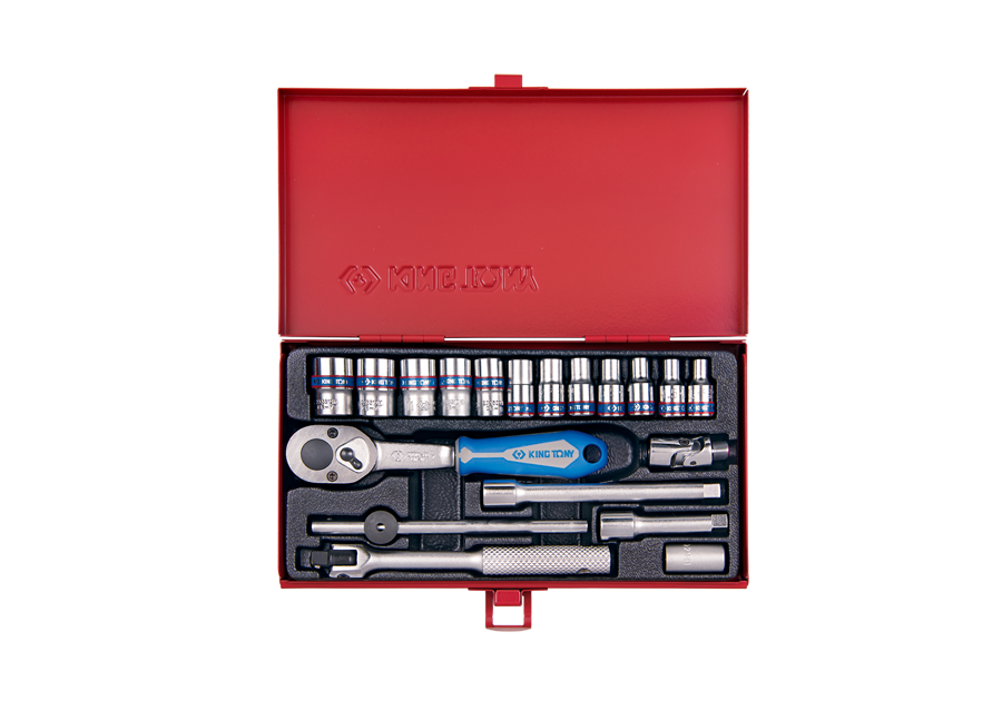 19 częsciowy zestaw narzędzi na 1/4" profesjonalnej marki King Tony. W zestawie znajdują się wysokiej klasy narzędzia, przeznaczone głównie do pracy zawodowej mechaników samochodowych. W skład kompletu wchodzą nasadki 12 kątne w rozmiarach 4, 4.5, 5, 5.5, 6, 7, 8, 9, 10, 11, 12, 13 [mm], grzechotka 1/4" z gumową rączką, pokrętło łamane, pokrętło przesuwne, dwie przesłużki, przegub Kardana oraz uchwyt do bitów. Zestaw w stylowej metalowej kasecie.