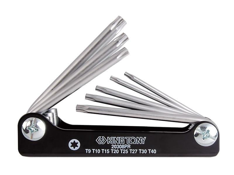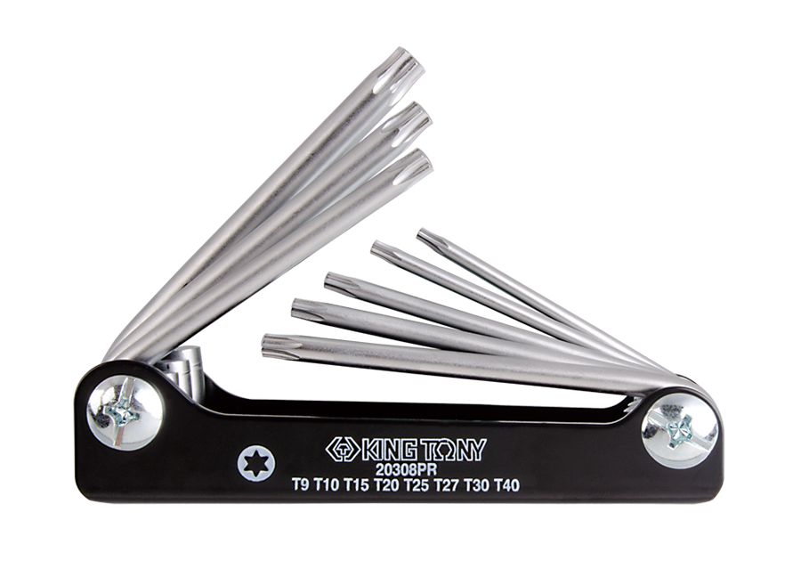 Zestaw profesjonalnych kluczy Torx firmy King Tony. Klucze znajdują się w wygodnym uchwycie wzorowanym na scyzoryku. W zestawie 8 różnych końcówek torx: T9, T10, T15, T20, T25, T27, T30, T40