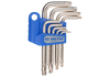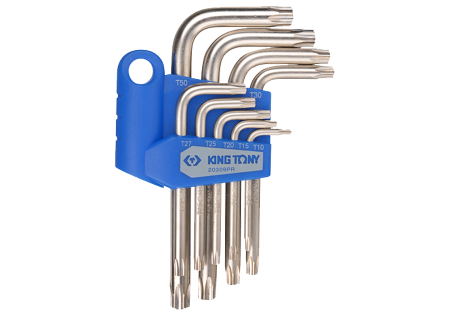 Zestaw kluczy imbusowych w plastikowym uchwycie. W zestawie znajduje się 9 kluczy profesjonalnej marki King Tony o rozmiarach: T10, T15, T20, T25, T27, T30, T40, T45, T50.