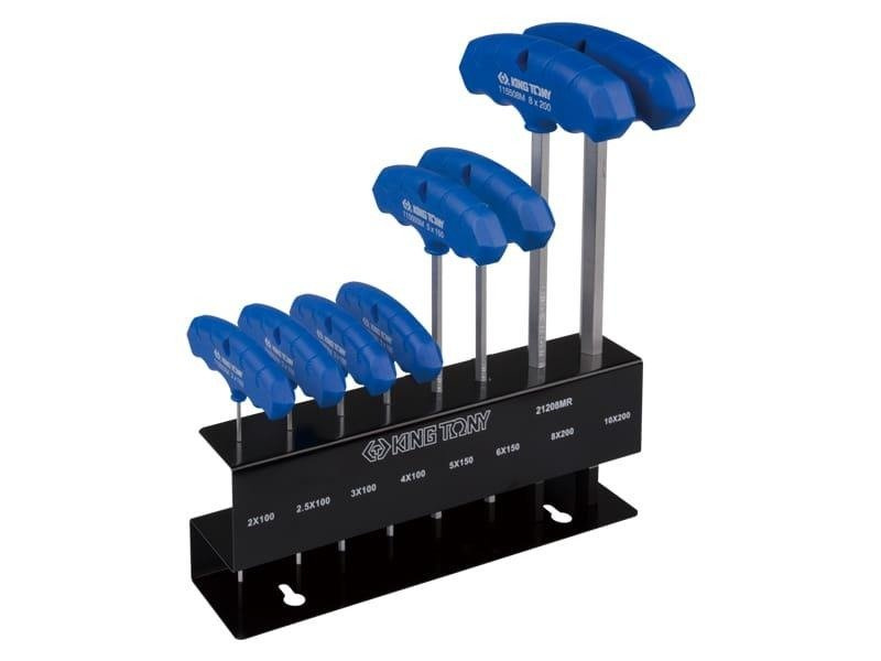 Komplet imbusów typu hex z kulką z ergonomicznym uchwytem plastikowym w metalowym stojaku. W zestawie znajduje się 8 kluczy o rozmiarach 2, 2.5, 3, 4, 5, 6, 8, 10.
