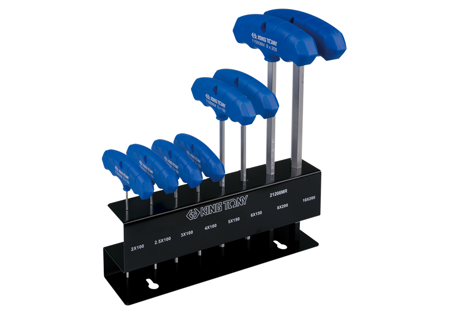 Komplet imbusów typu hex z ergonomicznym plastikowym uchwytem w metalowym stojaku King Tony. W zestawie są klucze o rozmiarach: 2, 2.5, 3, 4, 5, 6, 8, 10.