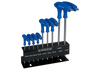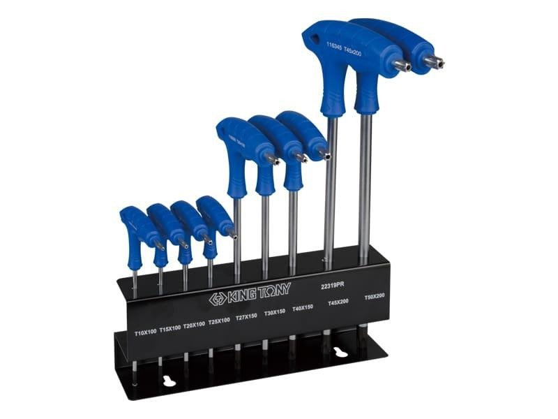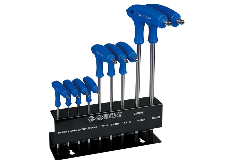 Komplet 9 imbusów torx wraz z metalowym stojakiem. W zestawie znajdują się klucze w kształcie litery L z wygodnym uchwytem oraz dwoma końcówkami Torx różnej długości. Klucze, które znajdują się w komplecie mają rozmiary: T10, T15, T20, T25, T27, T30, T45, T50