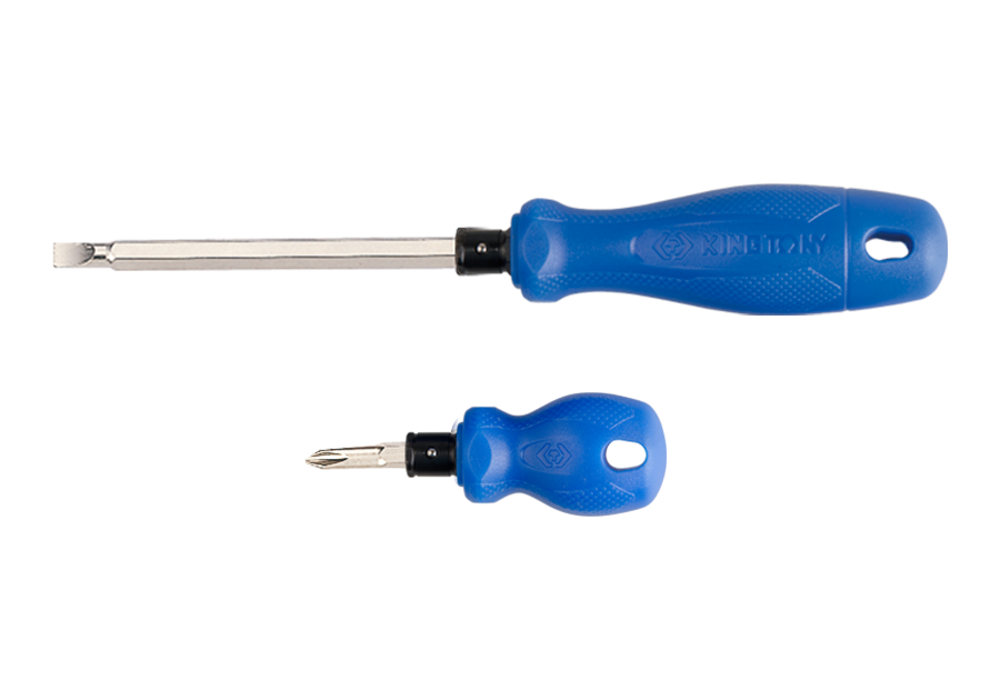 Wkrętak z wyjmowanym dwustronnym wkładem. Końcówki: krzyżakowa No.2 oraz płaska 6.5x1.2. Długość śrubokrętu 100mm
