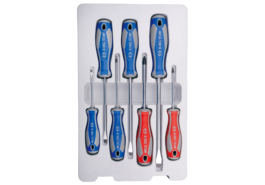 Komplet wkrętaków płaskich oraz krzyżakowych King Tony. Każdy wkrętak wykonany z wysoką precyzją, posiada gumową rączkę ułatwiającą pracę. W zestawie znajduje się 7 wkrętaków, dwa krzyżakowe: No.1x80 i No.2x100 oraz płaskie: 3x75, 4x100, 5.5x125, 6.5x150, 8x175.