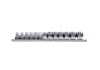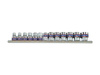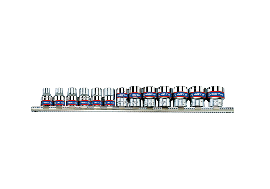 Komplet 13 nasadek 3/8" King Tony na szynie długości 290mm. Szyna łatwa w montażu na ścianie. W zestawie krótkie nasadki 12-kątne w rozmiarach 7-19mm.