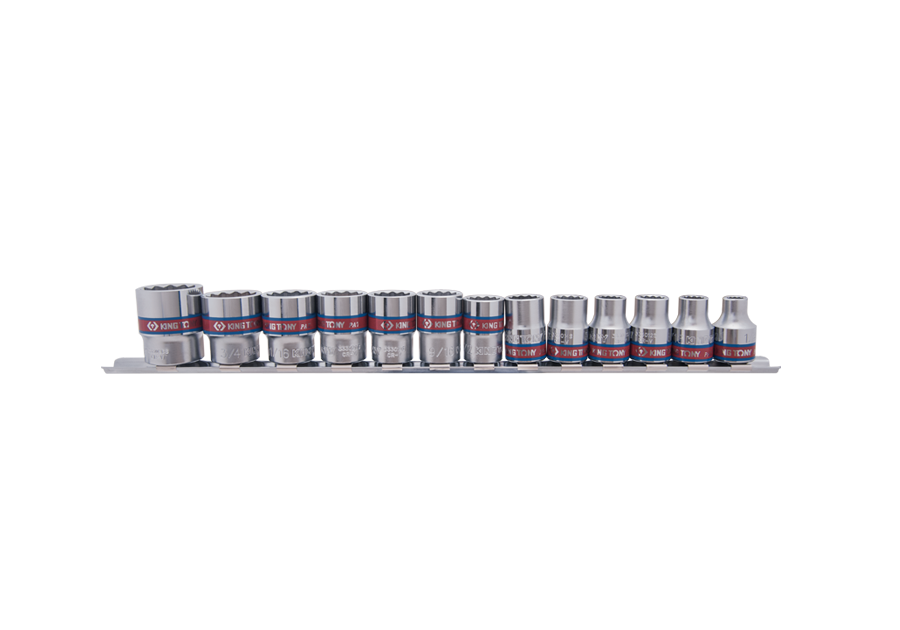 Komplet 13 nasadek 3/8" King Tony na szynie długości 290mm. Szyna łatwa w montażu na ścianie. W zestawie krótkie nasadki 12-kątne w rozmiarach calowych 1/4", 5/16", 11/32", 3/8", 7/16", 15/32", 1/2". 9/16", 19/32", 5/8", 11/16", 3/4", 13/16".