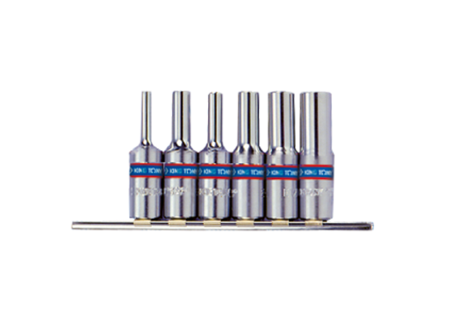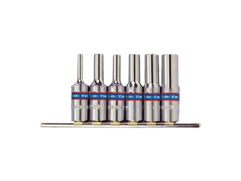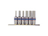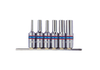 Komplet 6 długich nasadek gwiazdkowych 3/8" na szynie 150mm. W zestawie nasadki E4, E5, E8, E10, E12, E14