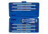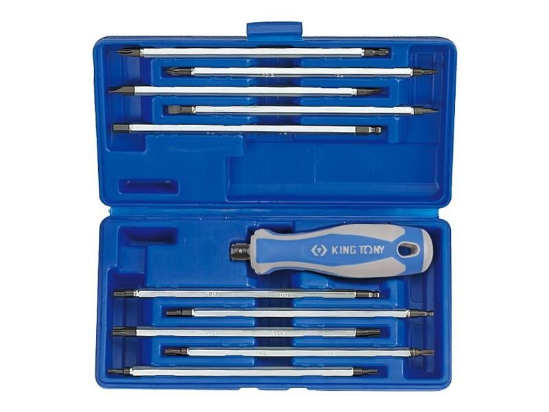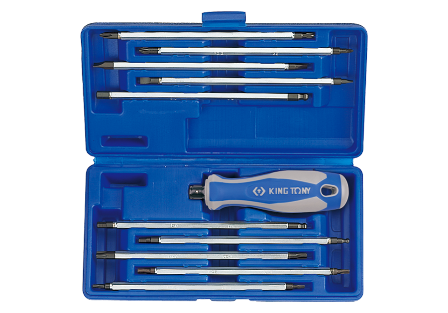 Komplet wkrętaków z wymiennymi grotami King Tony. Zestaw w plastikowym pudełku zawiera uniwersalną, gumowo-plastikową rączkę oraz 10 wkładów. Rozmiary wkładów: krzyżakowe PH1--PH2, pozidriv PZ2--PZ1, płaskie 4.0-6.0, 5.0x7.0, torx T10--T15, T20--T25, T30--T40, hex 4.0--4.0, 5.0--5.0, 6.0--6.0.