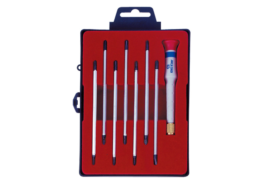 Komplet wkrętaków precyzyjnych z wymiennymi, dwustronnymi wkładami. W zestawie znajduje się uchwyt oraz 7 wkładów, każdy z dwoma końcówkami. Dostępne wkłady to: krzyżakowo-płaskie: PH00x2.0, PH0x3.0, PH1x4.0 oraz dwustronny torx: T6xT10, T7xT15, T8xT20, T9xT15
