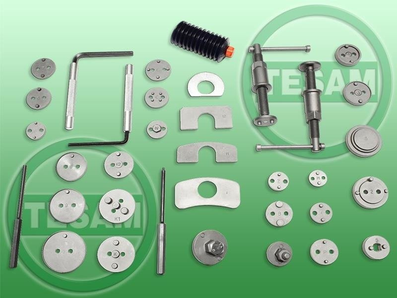 Zestaw do wkręcania tłoczka hamulcowego prawy lewy zawiera 35 sztuk narzędzi w tym 2 sztuki prasek (prawa lewa) do cofania tłoczka hamulcowego, klucz imbus 6 mm i 7mm, oraz dwa rodzaje wybijaków .