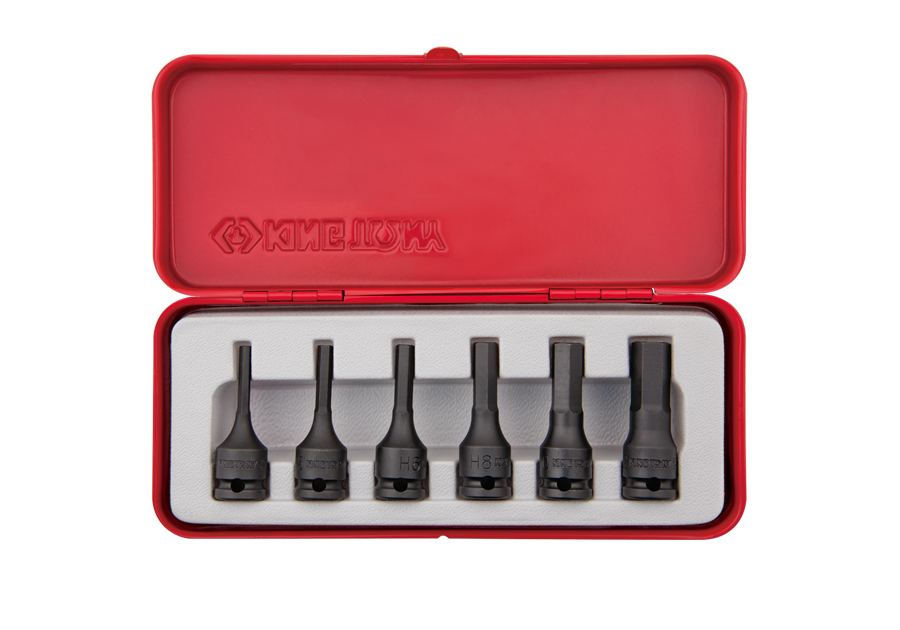 Komplet nasadek udarowych z końcówką hex King Tony w metalowej kasecie. W zestawie znajduje się 6 wysokiej jakości chromowo molibdenowych nasadek 3/8" długości 55mm z końcówkami hex w rozmiarach: 4, 5, 6, 8, 10, 12
