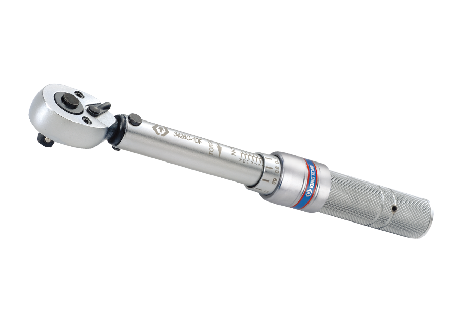 Mini klucz dynamometryczny 1/4" King Tony. Klucz z przyciskiem w grzechotce, ułatwiającym zdejmowanie nasadki. Długość klucza 249 mm, moment obrotowy regulowany w zakresie 5-25 Nm co 0.2Nm. Kierunek prawo/lewo.
