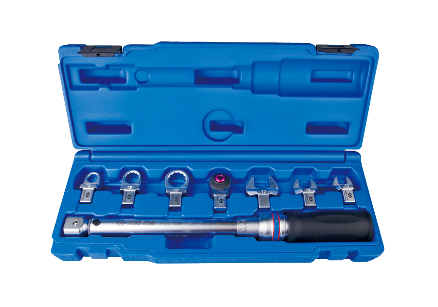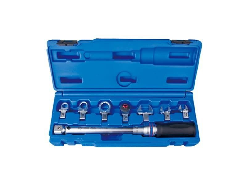 Zestaw klucza dynamometrycznego z wymiennymi głowicami. W komplecie klucz 4~20Nm, grzechotka 1/2" oraz końcówki płaskie i oczkowe o rozmiarach 10, 13, 17mm. System zmiennych głowic umożliwia dokręcenie śruby, do której nie ma dostępu od góry, z zadaną siłą przy pomocy końcówki płaskiej bądź oczkowej.