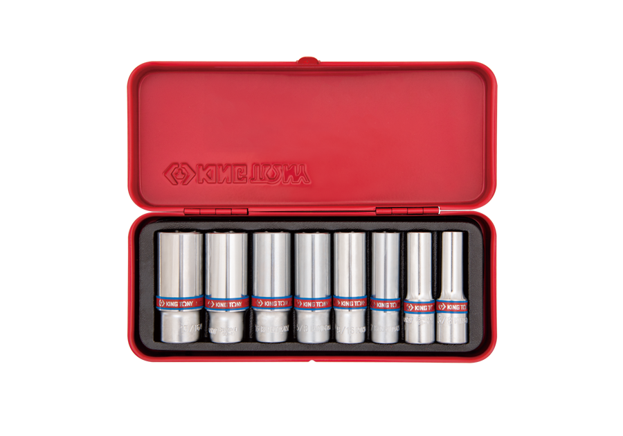Komplet nasadek calowych 3/8" King Tony. W zestawie znajduje się 8 nasadek długich (63mm) o końcówce 6-kątnej. Zestaw w metalowej kasecie. W zestawie znajdują się następujące nasadki: 3/8", 7/16", 1/2", 9/16", 5/8", 11/16", 3/4", 13/16"