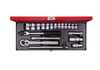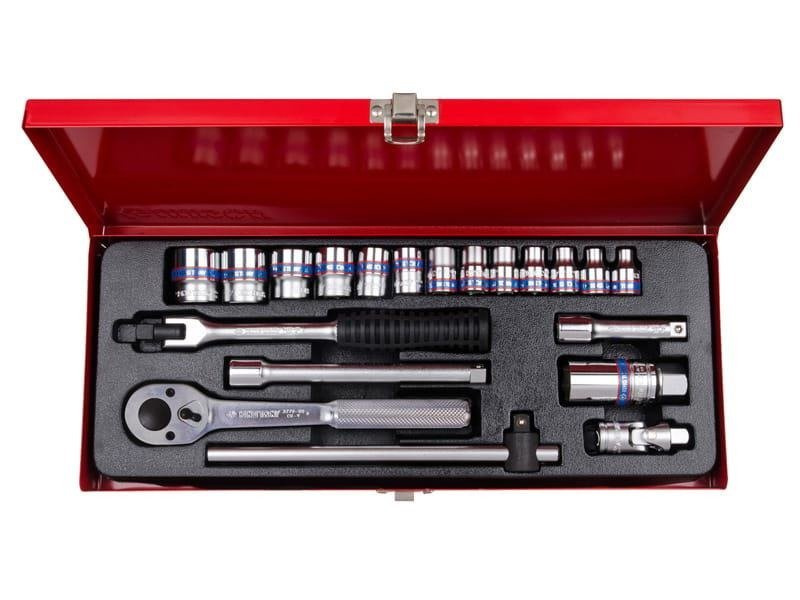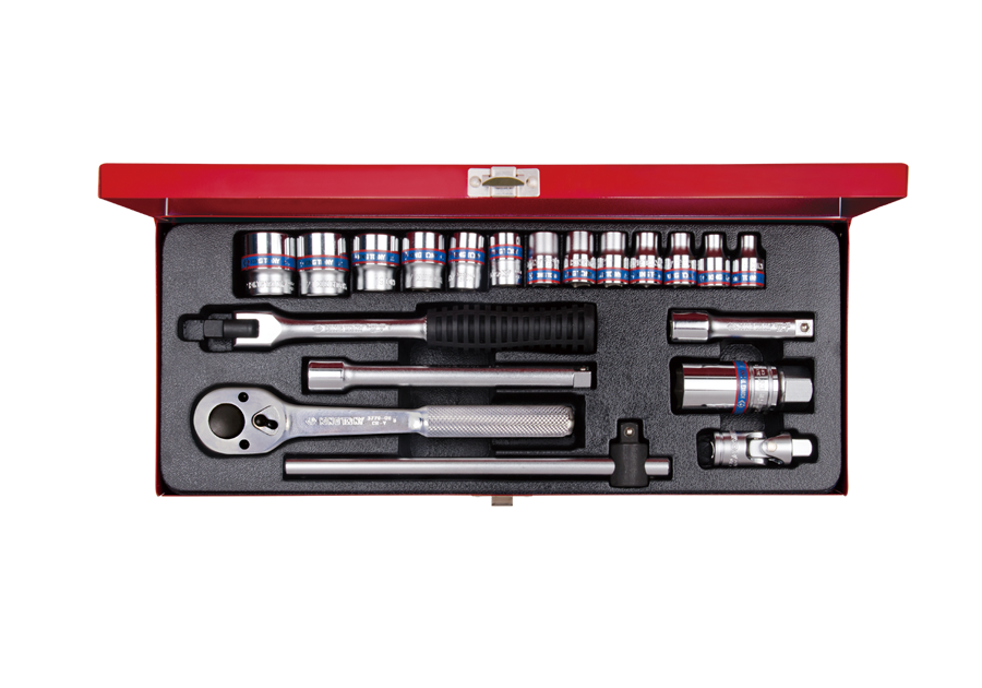 Komplet narzędzi 3/8" King Tony w metalowej kasecie. W zestawie znajdują się nasadki (3335M) 6-kątne krótkie w rozmiarach [mm]: 6, 7, 8, 9, 10, 11, 12, 13, 14, 17, 19, 21, 23, nasadka do świec 21mm (363521), grzechotka z moletowanym uchwytem (3779-08F), pokrętło łamane (3452-08G) oraz przesuwne (3571-08), dwie przedłużki (3221-03 i 06) oraz przegub Kardana (3792)