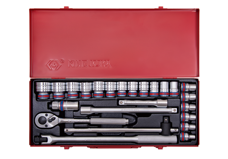 Zestaw narzędzi 1/2" King Tony w metalowej kasecie. W zestawie znajdują się nasadki krótkie, 12-kątne w rozmiarach calowych: 5/16", 3/8", 7/16", 15/32", 1/2", 9/16", 19/32", 5/8", 11/16", 3/4", 25/32", 13/16", 7/8", 15/16", 1", 1-1/16", 1-3/16", 1-1/4", nasadka do świec, 12-kątna, 21mm, przechotka z moletowaną rączką, pokrętło przesuwne, pokrętło łamane oraz dwie przedłużki.