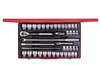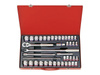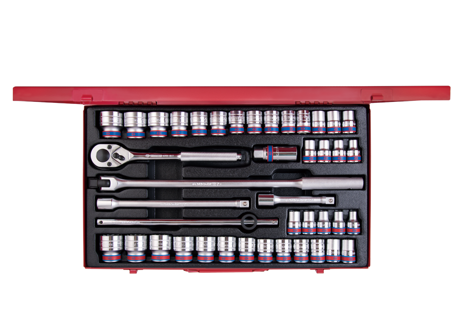 Komplet narzędzi 1/2" King Tony w metalowej kasecie. W zestawie znajdują się 42 narzędzia: nasadki krótkie 12-kątne w rozmiarach metrycznych 10-24mm, 27mm, 30mm, 32mm oraz calowych 5/16", 3/8", 7/16", 1/2", 9/16", 19/32", 5/8", 11/16", 3/4", 25/32", 13/16", 7/8", 15/16", 1", 1-1/16", 1-1/8", 1-3/16", 1-1/4", nasadka do świec 12-kątna, 21mm, grzechotka z moletowanym uchwytem, pokrętło łamane, pokrętło przesuwne oraz dwie przedłużki.