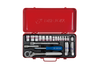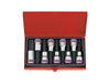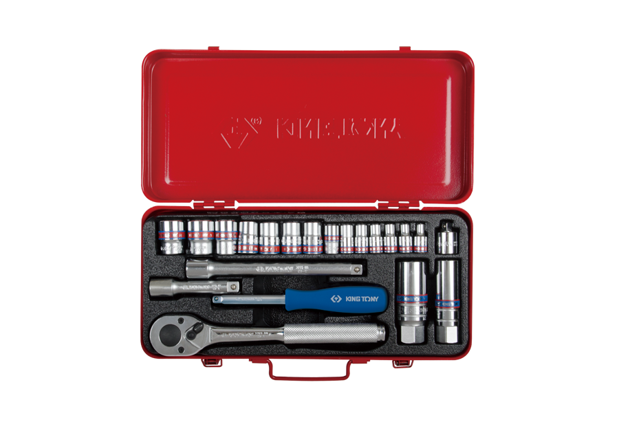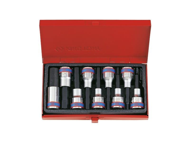 Komplet nasadek z końcówką hex firmy King Tony. Zestaw w metalowej kasecie zawiera 9 długich nasadek w rozmiarach: 4, 5, 6, 7, 8, 10, 12, 14, 17. Nasadki wykonane ze stali chromowo wanadowej, bity z chromowo molibdenowej.