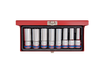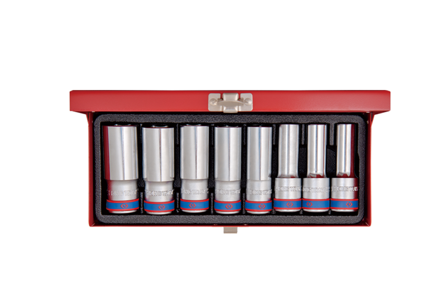 Zestaw długich nasadek 1/2" firmy King Tony. Komplet narzędzi w metalowym pudełku. W zestawie znajdują się nasadki w rozmiarach 12, 13, 14, 17, 19, 21, 22, 23.