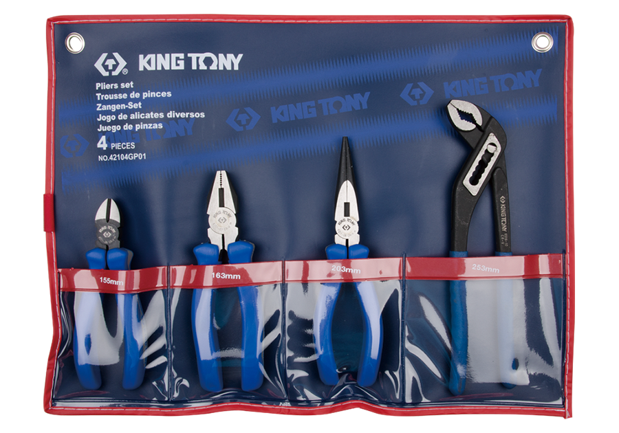 Komplet szczypiec firmy King Tony w wygodnym do zawieszenia na ścianie etui. W zestawie znajdują się 4 popularne szczypce: szczypce uniwersalne (kombinerki), szczypce tnące boczne, szczypce unwiersalne wąskie oraz szczypce nastawne z 7 stopniową regulacją.