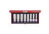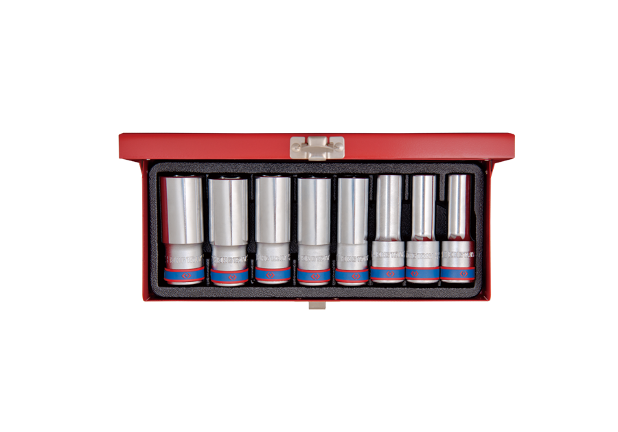 Zestaw długich nasadek 6-kątnych 1/2" firmy King Tony. Komplet narzędzi w metalowym pudełku. W zestawie znajdują się nasadki w rozmiarach 12, 13, 14, 17, 19, 21, 22, 23.