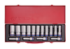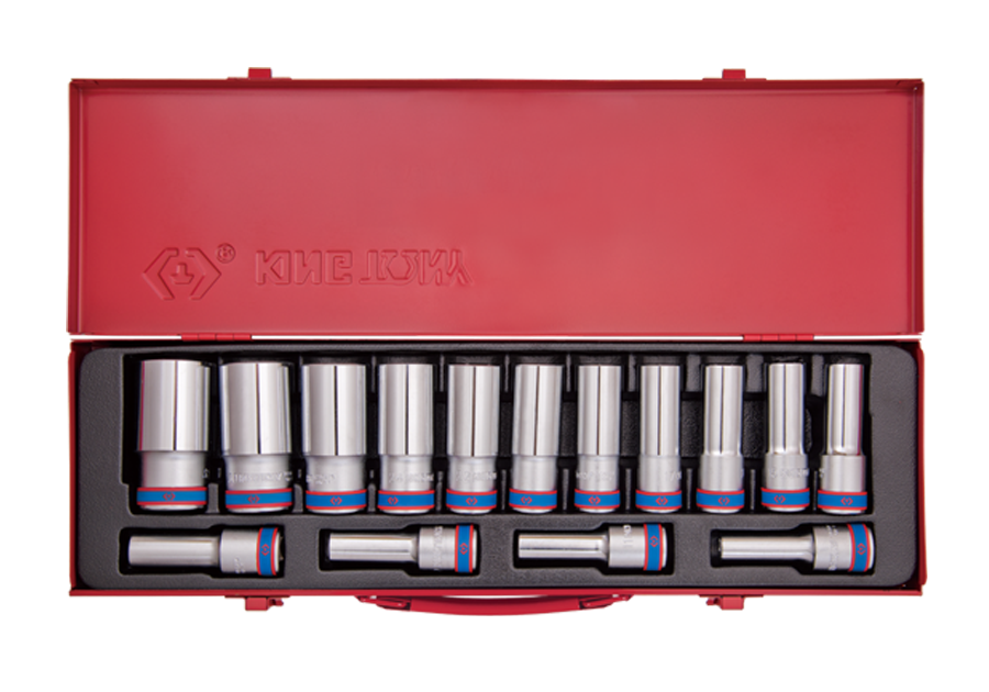 Komplet nasadek 1/2" firmy King Tony. W zestawie znajdują się długie nasadki 6-kątne w rozmiarach: 10, 11, 12, 13, 14, 15, 16, 17, 19, 21, 22, 24, 27, 30 oraz 32mm. Zestaw w metalowej kasecie.