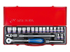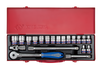 Zestaw nasadek 1/2" firmy King Tony wraz z akcesoriami. W zestawie znajdują się nasadki krótkie, 6-kątne w rozmiarach metrycznych: 8, 9, 10, 11, 12, 13, 14, 15, 16, 17, 18, 19, 21, 22, 24, 27, grzechotka z gumową rączką, dwie chromowane przedłużki oraz przegub Kardana.