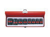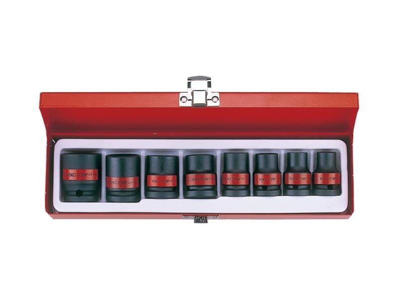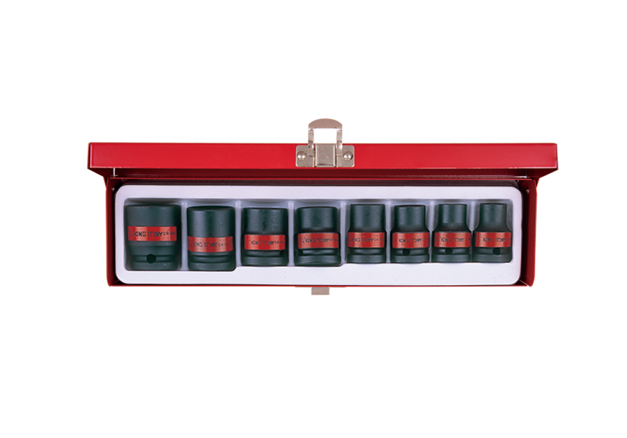 Komplet 6-kątnych, calowych nasadek udarowych 1/2" firmy King Tony. W zestawie 8 oryginalnych nasadek w rozmiarach 3/8", 7/16", 1/2", 9/16", 11/16", 3/4", 13/16", 15/16". Zestaw w metalowej kasecie.
