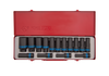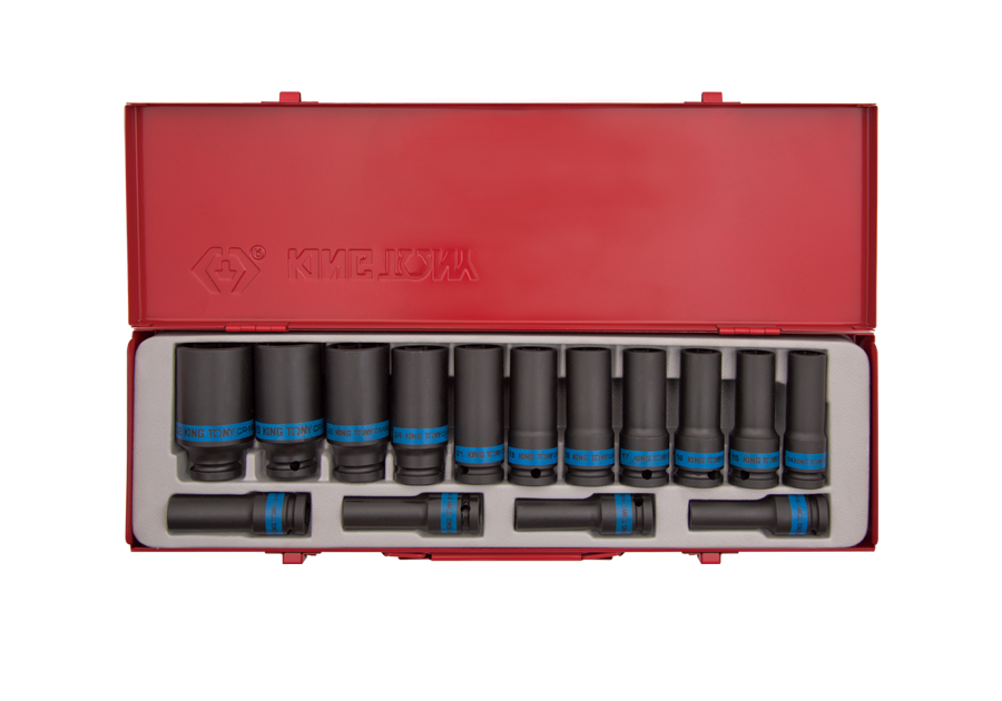 Komplet długich nasadek udarowych 1/2" firmy King Tony. W zestawie znajduje się 15 nasadek: 10, 11, 12, 13, 14, 15, 16, 17, 18, 19, 21, 24, 25, 29, 32. Zestaw w metalowej kasecie