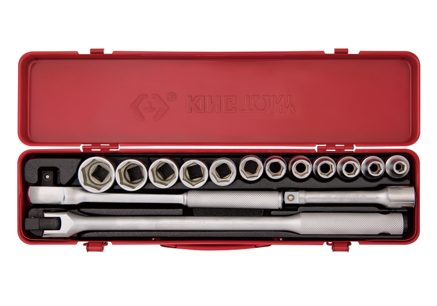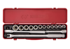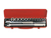 W zestawie: nasadki 6-kątne 1/2'' krótkie 8 , 10 , 11 , 12 , 13 , 14 , 17 , 19 , 21 , 22 , 24 , 27 mm, przedłużka 1/2'' 125 mm, pokrętło łamane 1/2'' 375 mm, grzechotka 1/2'' 250 mm
