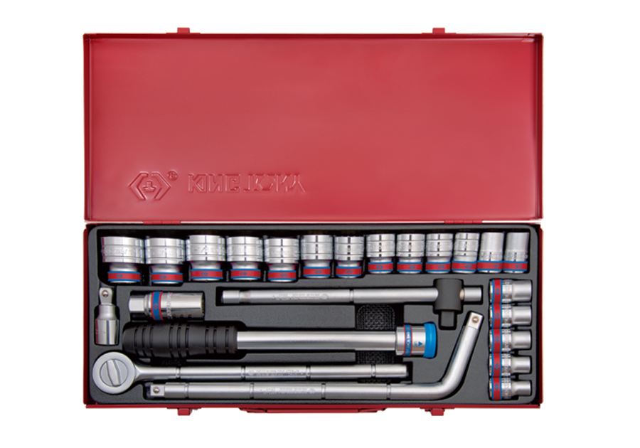 Komplet narzędzi 1/2" 24 częsci. W zestawie nasadki 6-kątne krótkie w rozmiarach calowych 3/8", 7/16", 15/32", 1/2", 9/16", 19/32", 5/8", 11/16", 3/4", 25/32", 13/16", 7/8", 15/16", 1", 1-1/16", 1-1/8", 1-3/16", 1-1/4" , nasadka 6-kątna do świec 21mm, grzechotka z rączką umożliwiającą użycie przedłużki wraz z przystosowaną do tego przedłużką z gumową rączką, przedłużka uchylna, pokrętło przesuwne oraz pokrętło typu L z uchwytem do przedłużki