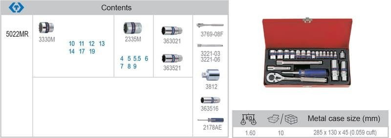 ZESTAW NASADEK 1/4'' + 3/8'' 21cz. KRÓTKIE 12-kąt. 10 - 19mm, 6-kąt. 4 - 9mm Z AKCESORIAMI, CHROM, KASETA
