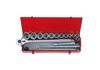 Komplet narzędzi 3/4" King Tony. W zestawie znajdują się nasadki krótkie 12-kątne w rozmiarach 21, 22, 23, 24, 25, 30, 32, 36, 38, 41, 46, 50, grzechotka z moletowanym uchwytem, dwie chromowane przedłużki oraz pokrętło przesuwne. Zestaw w metalowej kasecie