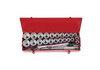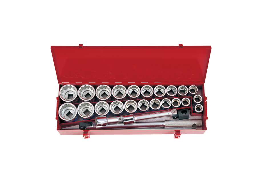 Zestaw metryczno-calowych nasadek oraz narzędzi 3/4" firmy King Tony. Zestaw w metalowej kasecie zawiera 22 nasadki 12 kątnych oraz pokrętło łamane, dwie przedłużki i pokrętło przesuwne. Zawarte w zestawie, krótkie nasadki 12-kątne są w rozmiarach metrycznych: 22, 24, 27, 30, 32, 36, 38, 41, 46, 50 oraz calowych 7/8",15/16", 1", 1-1/8", 1-5/16", 1-3/8", 1-7/16", 1-1/2", 1-5/8", 1-3/4", 1-7/8", 2"