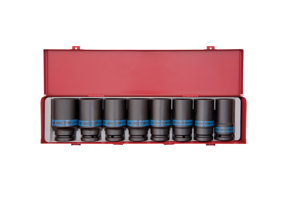 Komplet długich nasadek udarowych 6-kątnych King Tony. W zestawie znajdują się nasadki metryczne w rozmiarach 26, 29, 30, 32, 34, 35, 36, 38. Zestaw w metalowej kasecie.