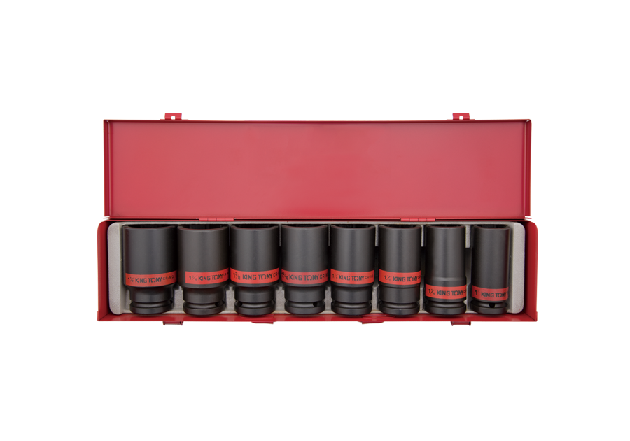Komplet długich nasadek udarowych 6-kątnych King Tony. W zestawie znajdują się nasadki calowe w rozmiarach 1", 1-1/16", 1-1/8", 1-1/4", 1-5/16", 1-3/8", 1-7/16", 1-1/2". Zestaw w metalowej kasecie.