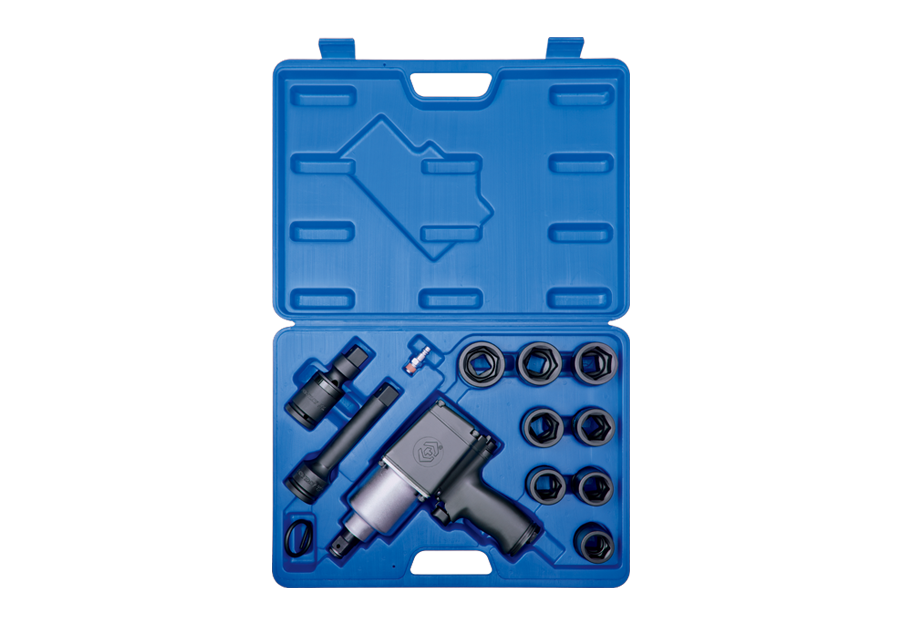 Komplet narzędzi pneumatycznych 3/4" wraz z kluczem pneumatycznym 1085Nm firmy King Tony. W zestawie znajduje się klucz pneumatyczny 3/4", 8 6-kątnych nasadek w rozmiarach 26, 27, 28, 30, 32, 35, 35, 38, przedłużka udarowa, przegub kulisty oraz o-ring i przetyczna zabezpieczające do nasadek udarowych.