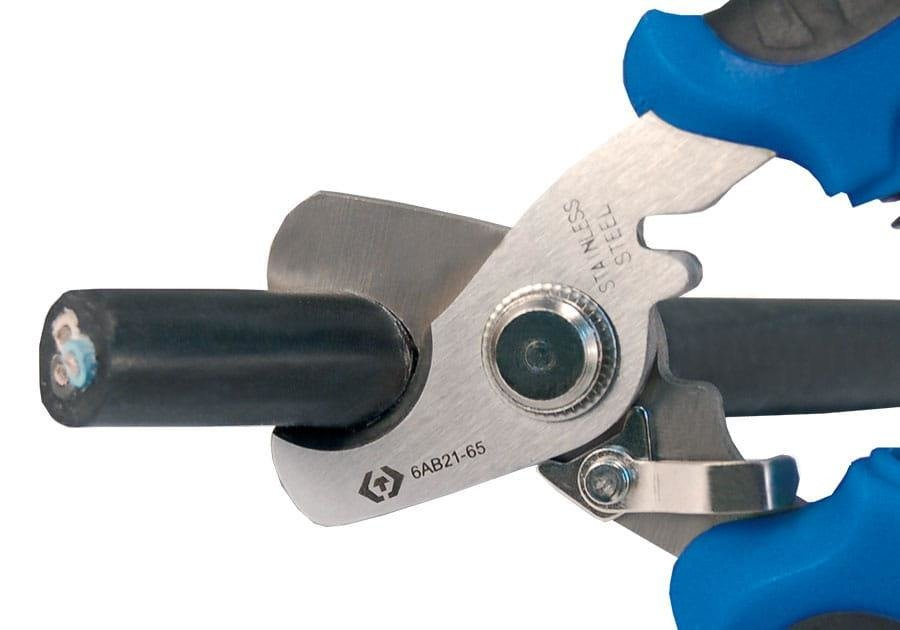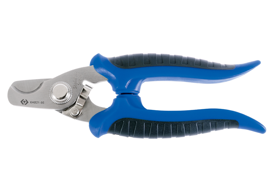 Zaokrąglone nożyczki dla elektryków z blokadą ostrza.