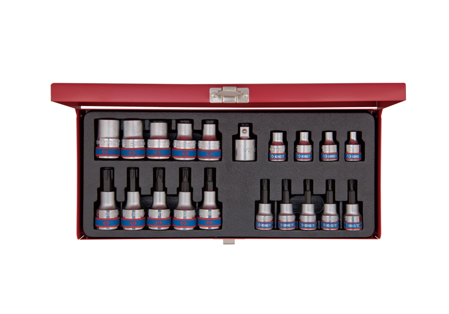 Komplet nasadek gwiazdkowcyh oraz nasadek z końcówką Torx firmy King Tony. W zestawie znajdują się nasadki gwiazdkowe 3/8" w rozmiarach E6, E7, E8, E10, nasadki gwiazdkowe 1/2" w rozmiarach E12, E14, E16, E18, E20, nasadki z końcówką torx 1/2" T30, T40, T45, T50, T55 oraz redukcja z 1/2 na 3/8". Cały zestaw w metalowej kasecie.
