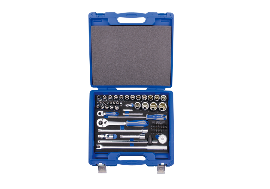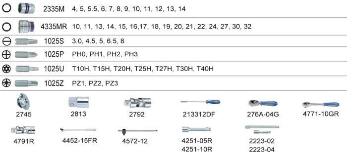 • ZESTAW NASADEK 1/4"+1/2" 60cz. KRÓTKIE 6-kąt.4-32mm Z AKCESORIAMI, CHROM, KASETA Z TWORZYWA