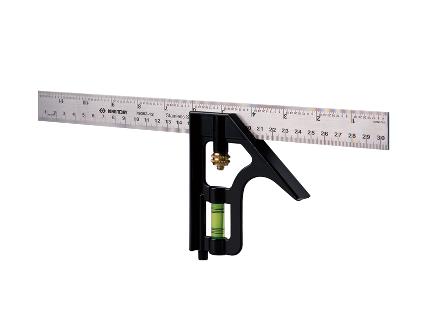 Kątownik wielofunkcyjny, metryczny i calowy oznaczone na liniale