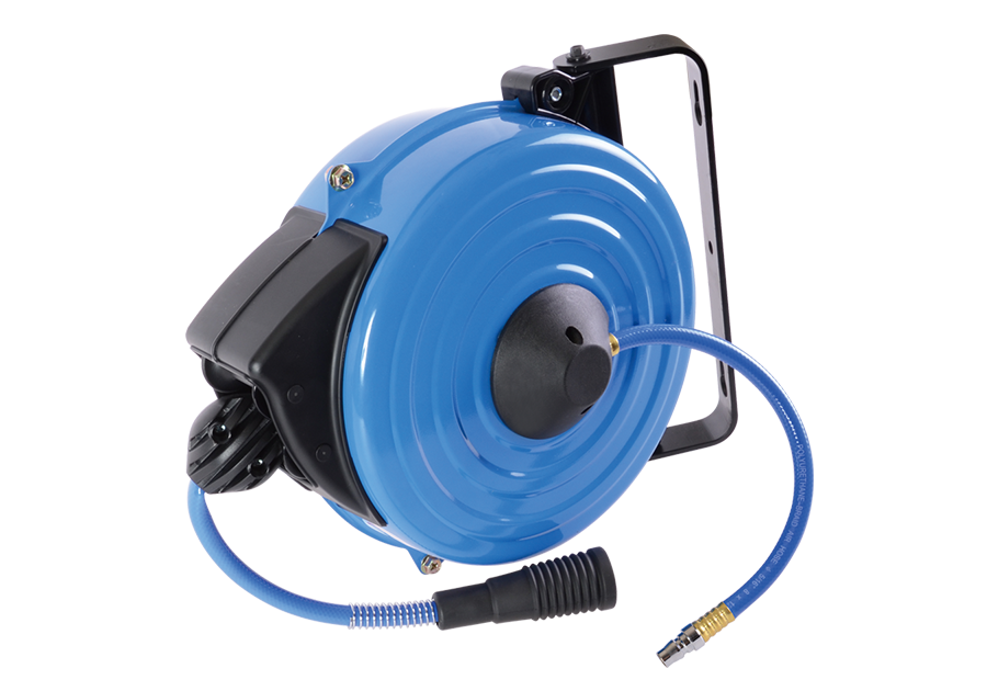 Automatyczny zwijacz z wężem do sprężonego powietrza. Można go przykręcić np. do ściany lub ścianki regału na tyle wysoko, by nie przeszkadzał w pracy, a końcówka z szybkozłączką była w zasięgu ręki .Bęben ma wbudowaną sprężynę powrotną – po zakończeniu pracy mechanizm szybko zwinie wąż. Maksymalne ciśnienie robocze: 20 bar, przyłącze 1/4”.
