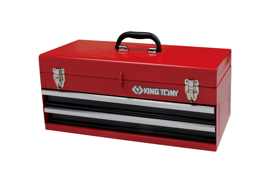 Skrzynka z wytrzymałej stali, malowana proszkowo , zamknięcie pokrywy blokuje wszystkie szuflady.