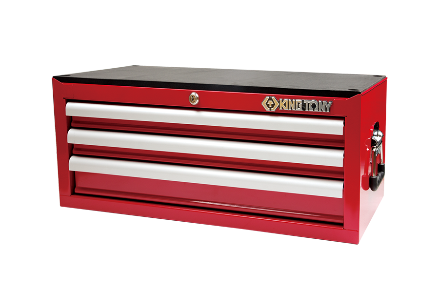 Wytrzymała konstrukcja stalowa, szuflady z łożyskowanymi prowadnicami, moletowany na całej szerokości uchwyt szuflady, centralny zamek, 10 mm górna mata, skrzynka malowana proszkowo, 4 kołki na narożnikach dla bezpiecznego połączenia z górną skrzynką.
