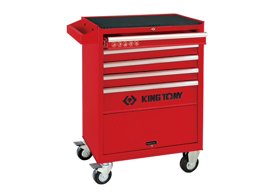 Wózek warsztatowy King Tony z 5 szufladami i dolną półką. Szuflady łożyskowane z wygodnym uchwytem, ładowność wózka 360kg, malowany proszkowo, centralny zamek, jednoczęściowy stalowy korpus, góra zabezpieczona 10 mm matą gumową, przemysłowe kółka z hamulcem do podłogi TPR